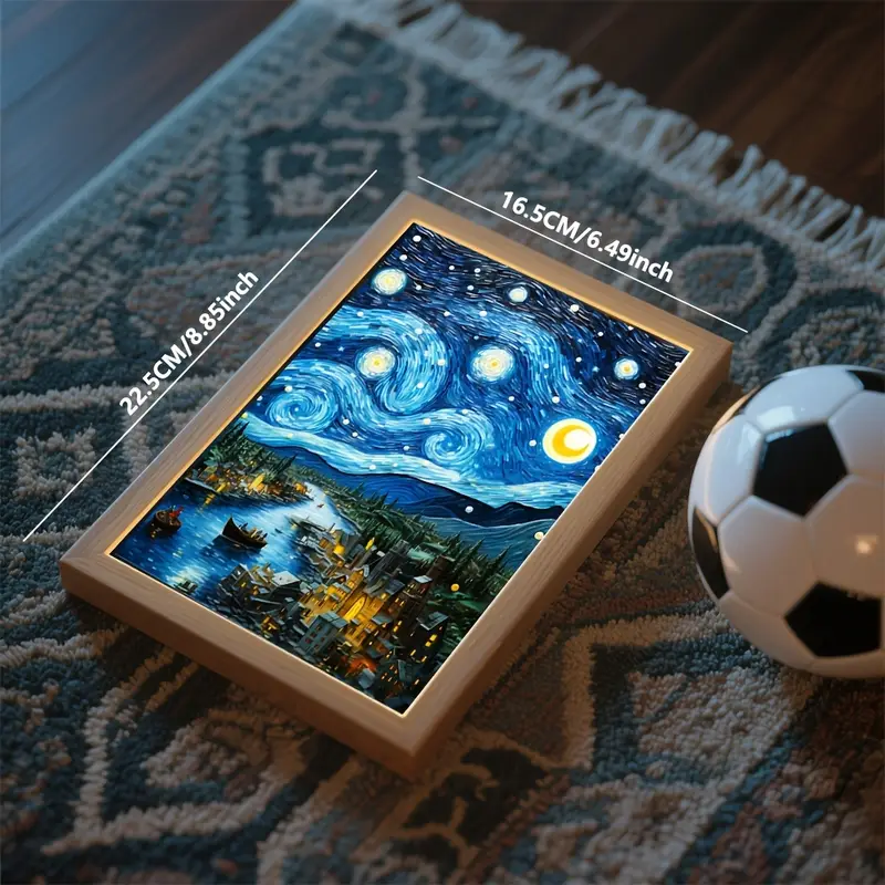 Van Gogh Starry Night LED Frame Light - USB Powered, Adjustable Wall & Tabletop Decorative Lamp with Warm to Cool-Tempered Lighting for Bedroom, Office, and Home Ambiance, Bedroom Night Light | Art Deco Style | Wooden Frame Light, LED Lights for Bedroom